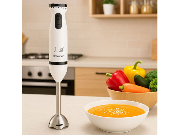 Blenderul de mana Delimano Primera are o putere de 600 W, functie turbo si reglare lina a vitezei. Capacitatea maxima este de 900 ml, cu utilizare recomandata pana la 700 ml. Este usor de folosit cu ambele maini si ideal pentru piureuri, smoothie-uri sau sosuri.