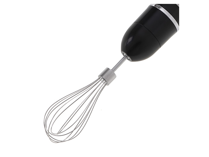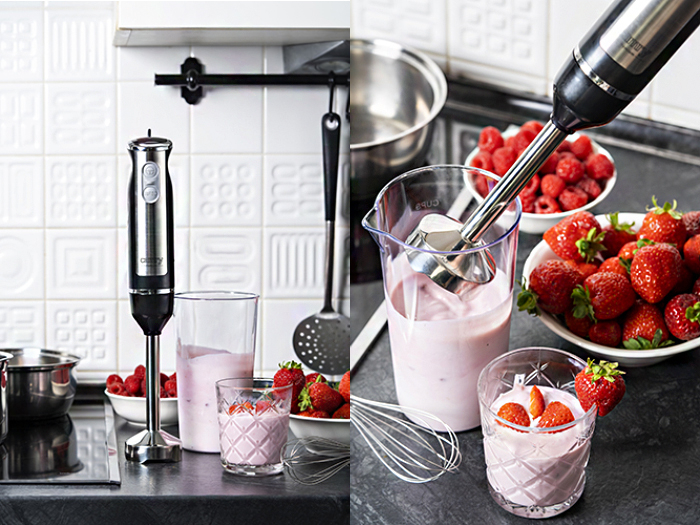 Blenderul de mana este o alegere excelenta pentru persoanele care apreciaza modalitatile usoare de a pregati alimente sanatoase intr-un timp scurt. Blenderul este echipat cu o cana de masurare: 600 ml, un accesoriu pentru blender din otel inoxidabil si un tel. In plus, blenderul va functiona intr-o bucatarie traditionala, permitandu-va sa bateti si sa pregatiti cu usurinta tot felul de mousse, supe crema, aluat de clatite si alte feluri de mancare care necesita o consistenta similara.