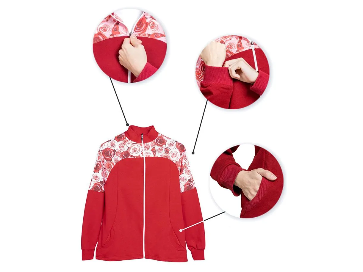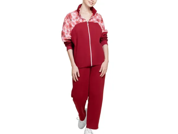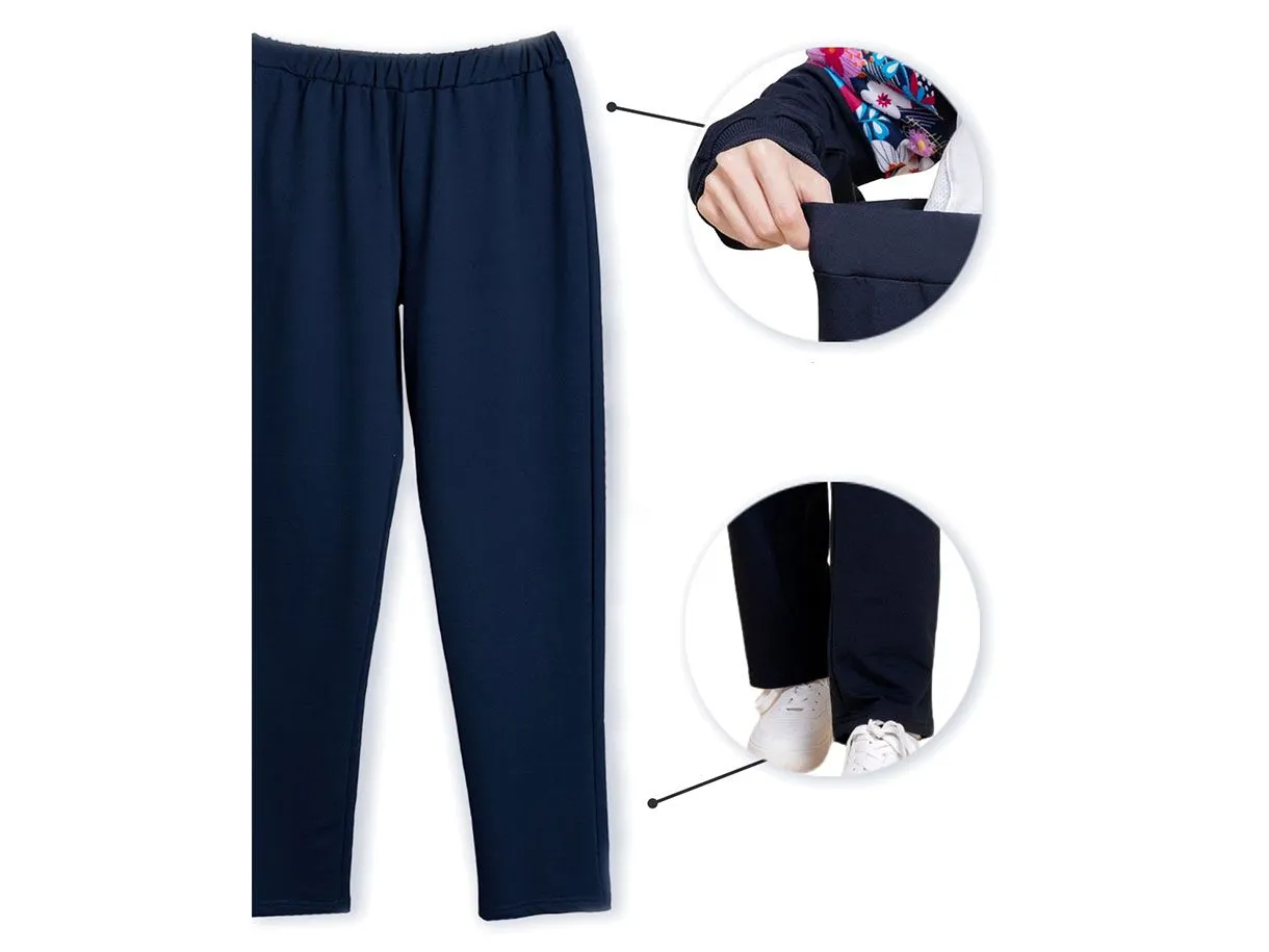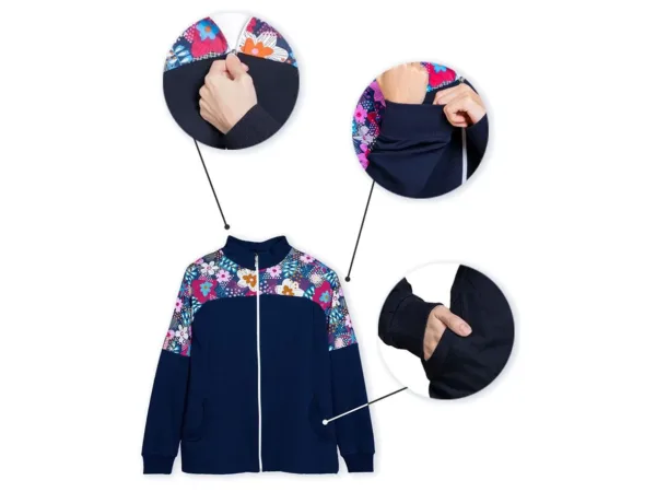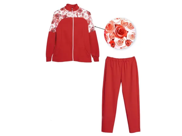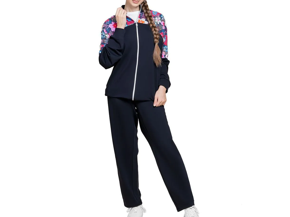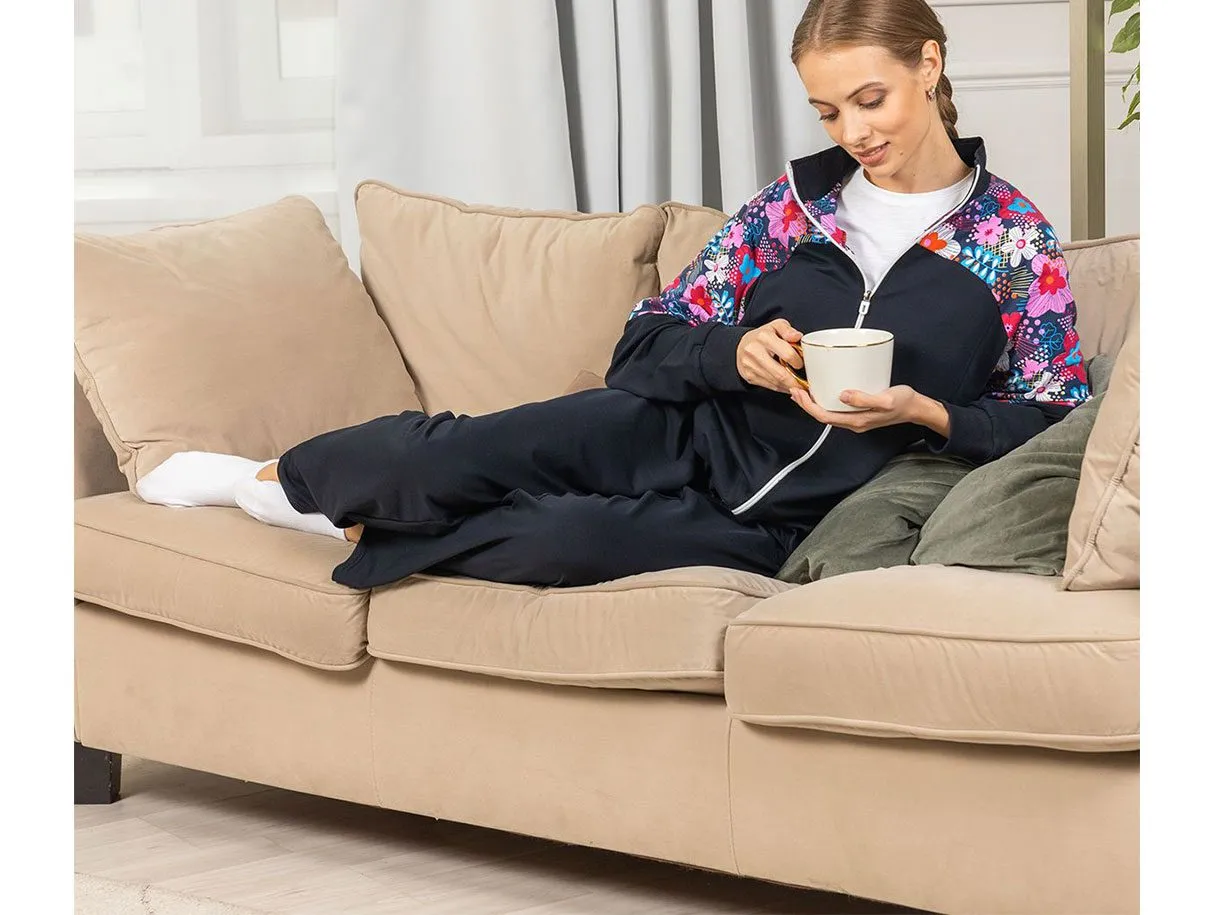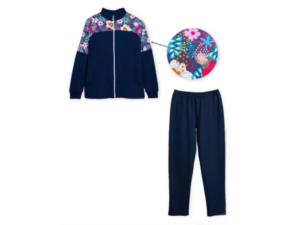 Setul este compus din jachetă cu fermoar, buzunare practice, inserții și un imprimeu floral elegant, precum și pantaloni uni cu croi drept. Mâneca lungă oferă căldură și acoperă eventualele imperfecțiuni ale siluetei. Materialul – 80% bumbac și 20% poliester – este respirabil, plăcut la atingere și își păstrează forma chiar și după purtări frecvente.