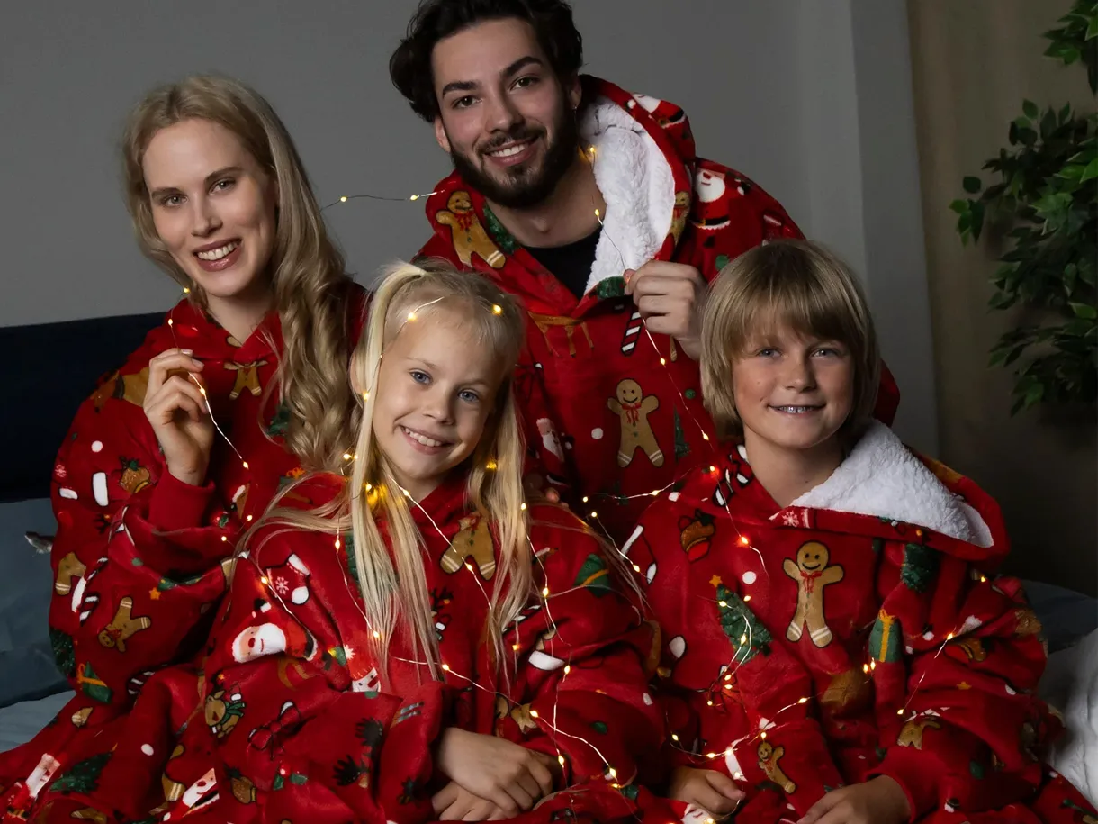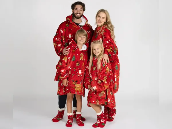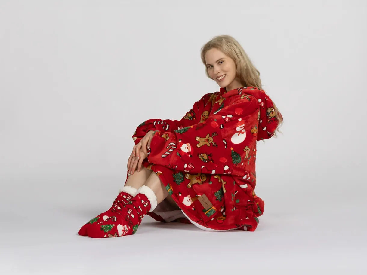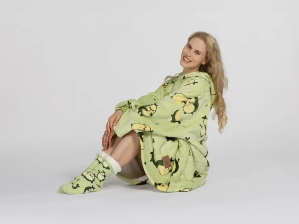 Setul include o pereche de șosete moi cu talpă antiderapantă. Acest pachet este alegerea perfectă pentru a fi oferit celor dragi. Hanoracul cu glugă se potrivește atât adulților, cât și copiilor, iar mărimea universală îl face potrivit pentru întreaga familie. Culorile vii și designul modern vor aduce buna dispoziție și vor transforma fiecare seară într-un moment special.
