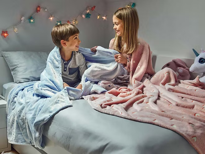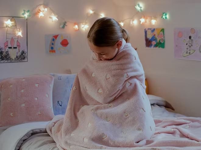 Setul pentru copii Dormeo Warm Hug este disponibil in doua variante: roz cu inimioare si albastru cu tematica spatiala. Elementele care stralucesc in intuneric adauga un plus de magie, creand o atmosfera de poveste in camera imediat ce se stinge lumina. Copiii vor fi incantati de stralucirea delicata, transformand ora de culcare intr-o aventura captivanta.