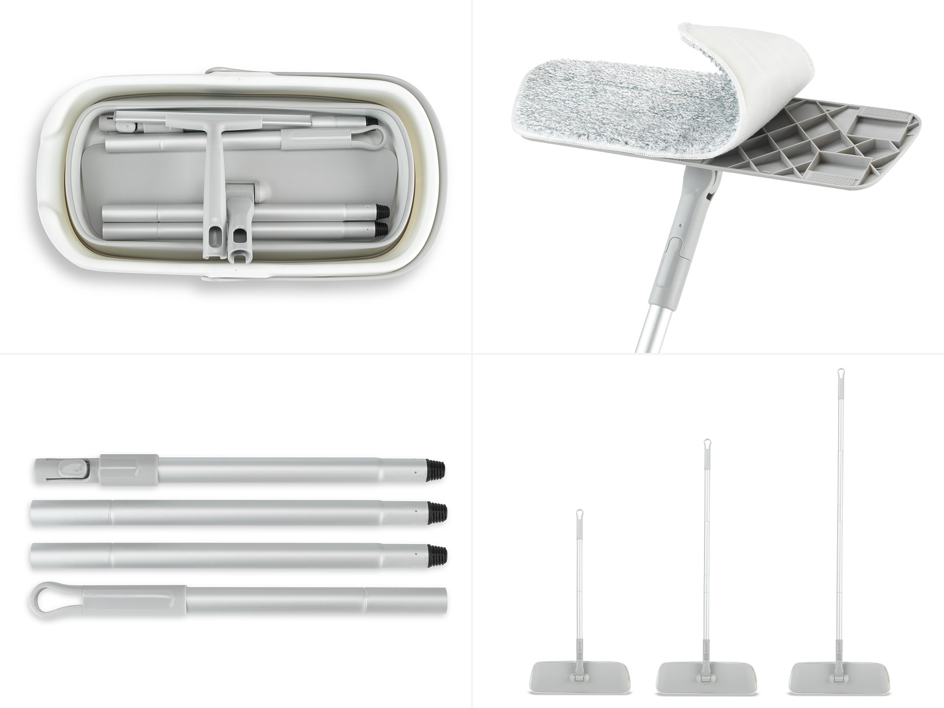 - Capul mopului si racleta pot fi atasate foarte rapid de mainerul cu dimensiunea de 124 cm. Mainerul in sine se pliaza in 4 parti pentru o depozitare comoda.