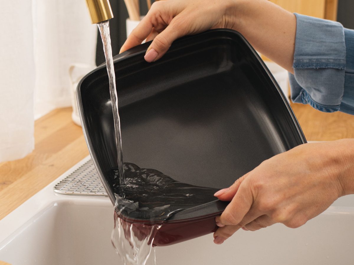 Dupa utilizare tava se spala foarte usor in masina de vase. Spalarea manuala de asemenea nu o sa va creeze probleme.